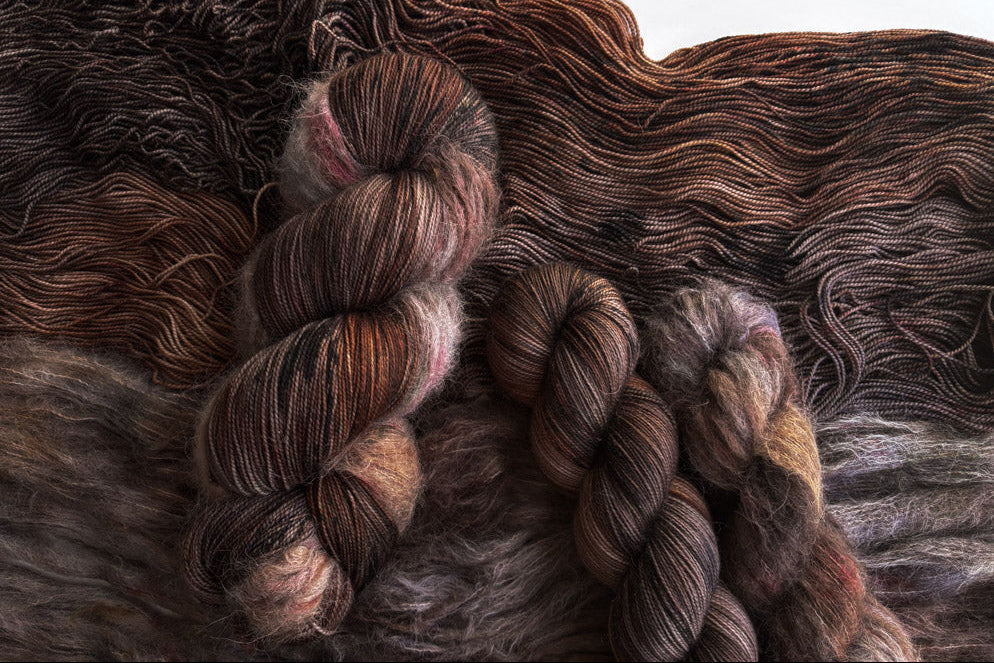 This colorway is a rich-as-can-be with a warm taupe base, chocolatey brown and caramel pours, all sprinkled with charcoal and mahogany speckles!