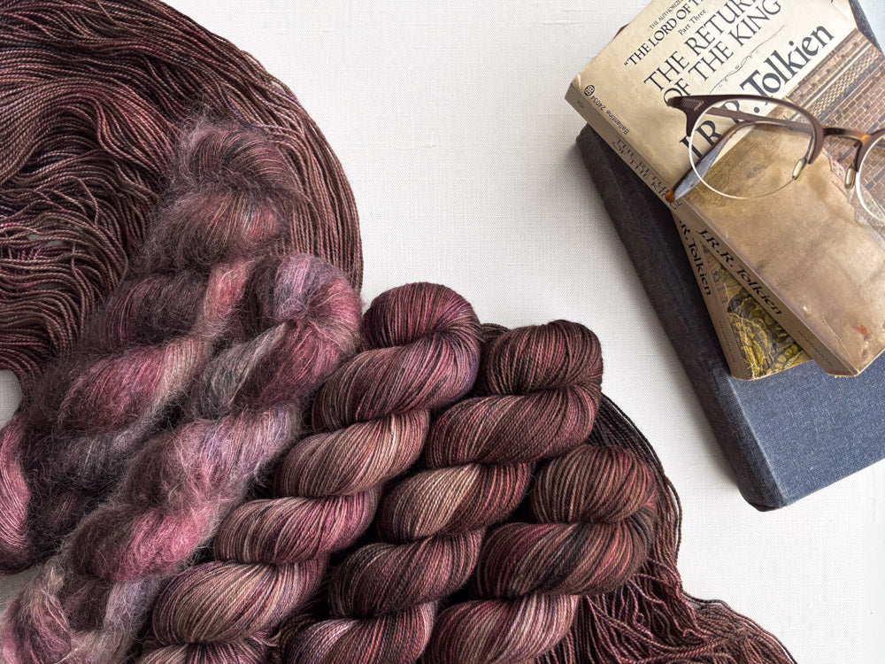 Colorway shown in the following order: Mohair, Suri, Phyllis Sock, Merino Sock, DK