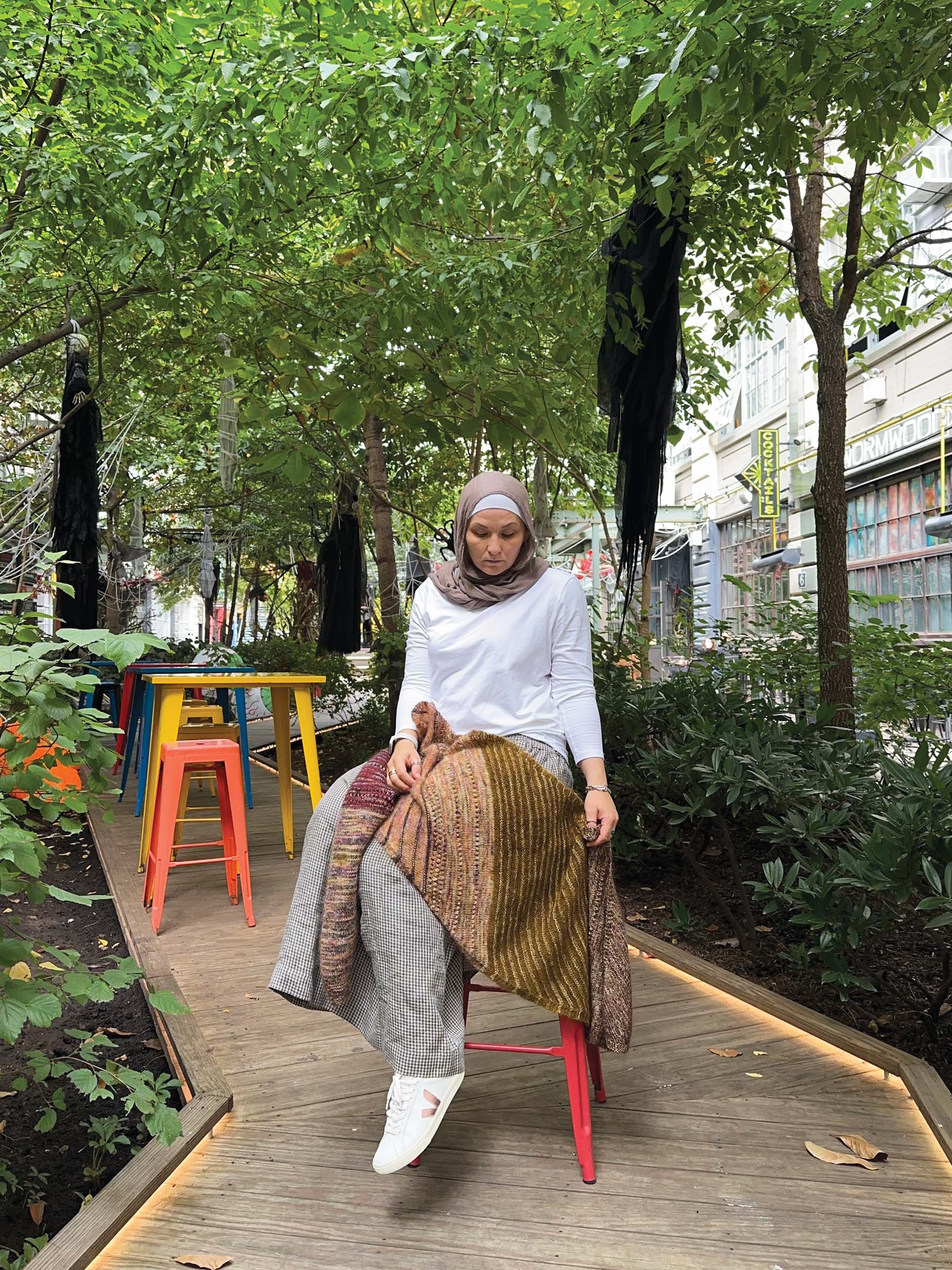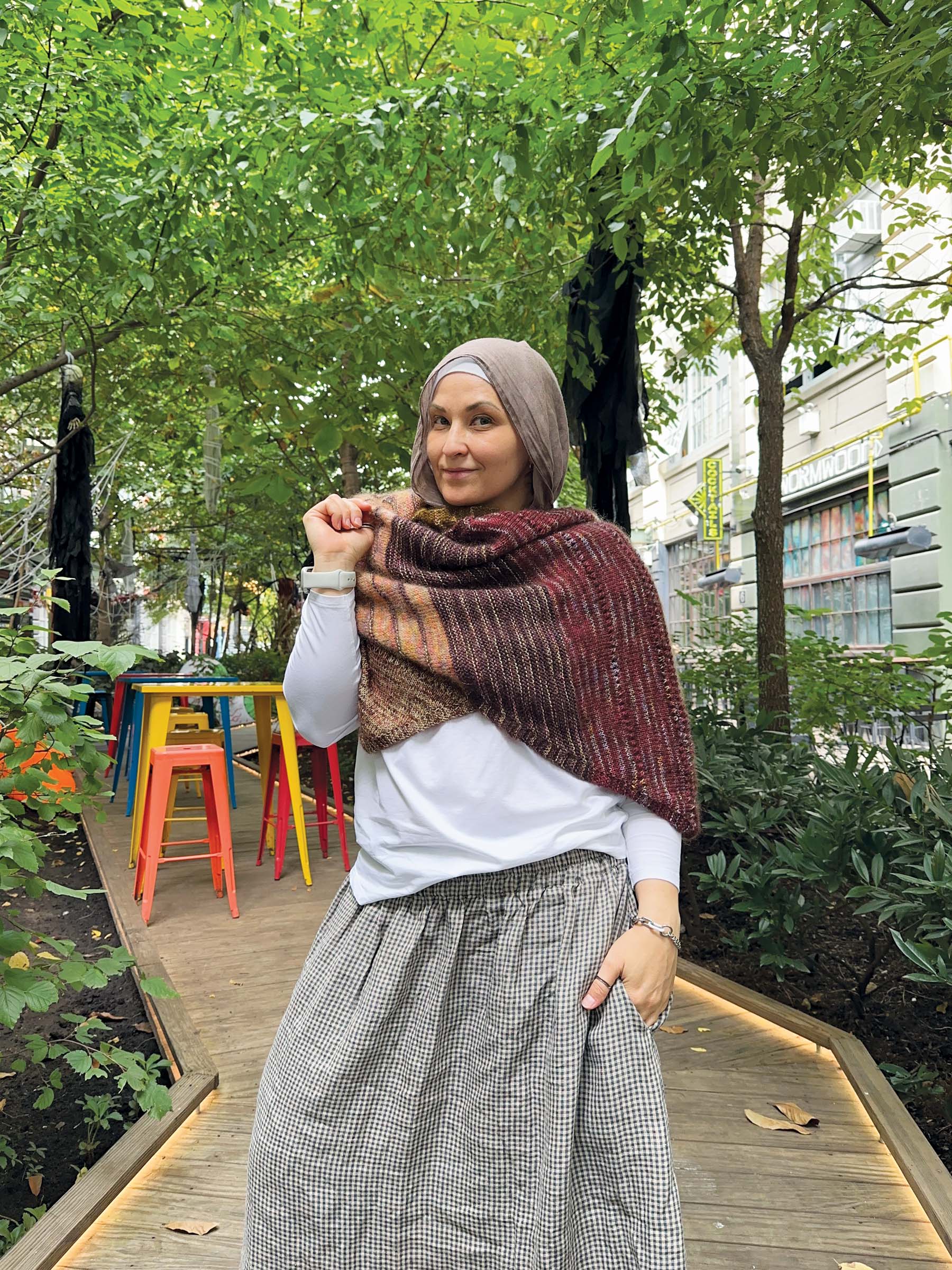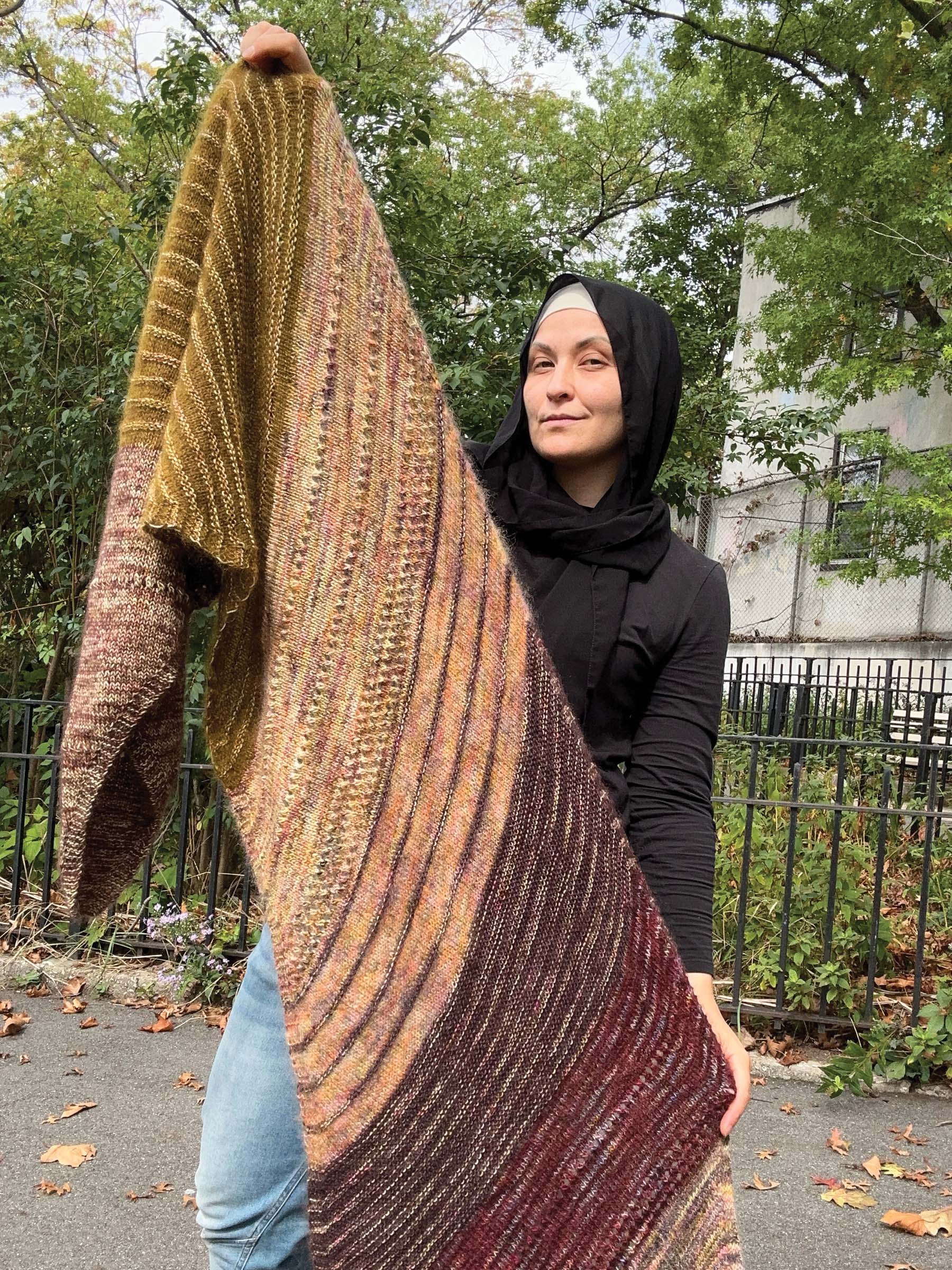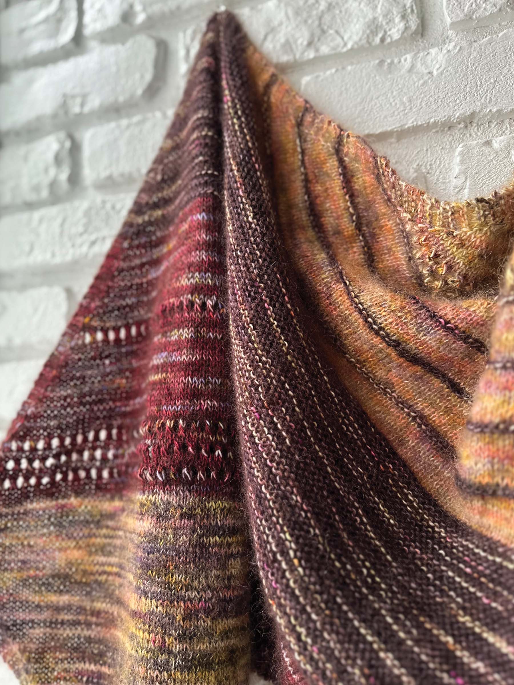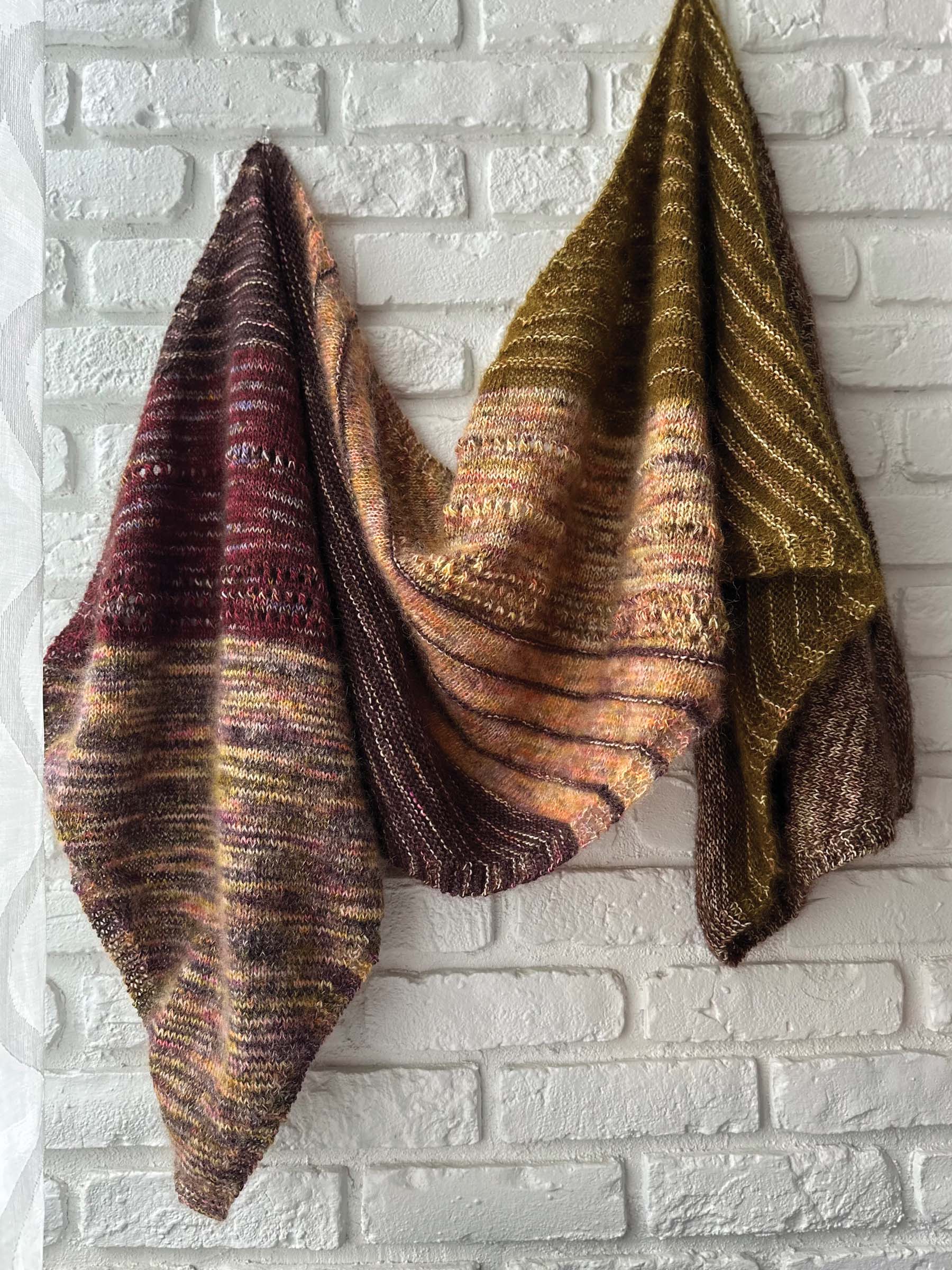 Nutmeg is a generously sized rectangular scarf knit on the bias, creating a graceful diagonal drape. The construction is intentionally simple, allowing the design to shine through its blend of six colors and two yarn bases. Much like a well-balanced rosé, the shifting stripes feel light, layered, and a little unexpected, with each color change adding a new note to the composition, elevating the design into a playful yet sophisticated statement piece.