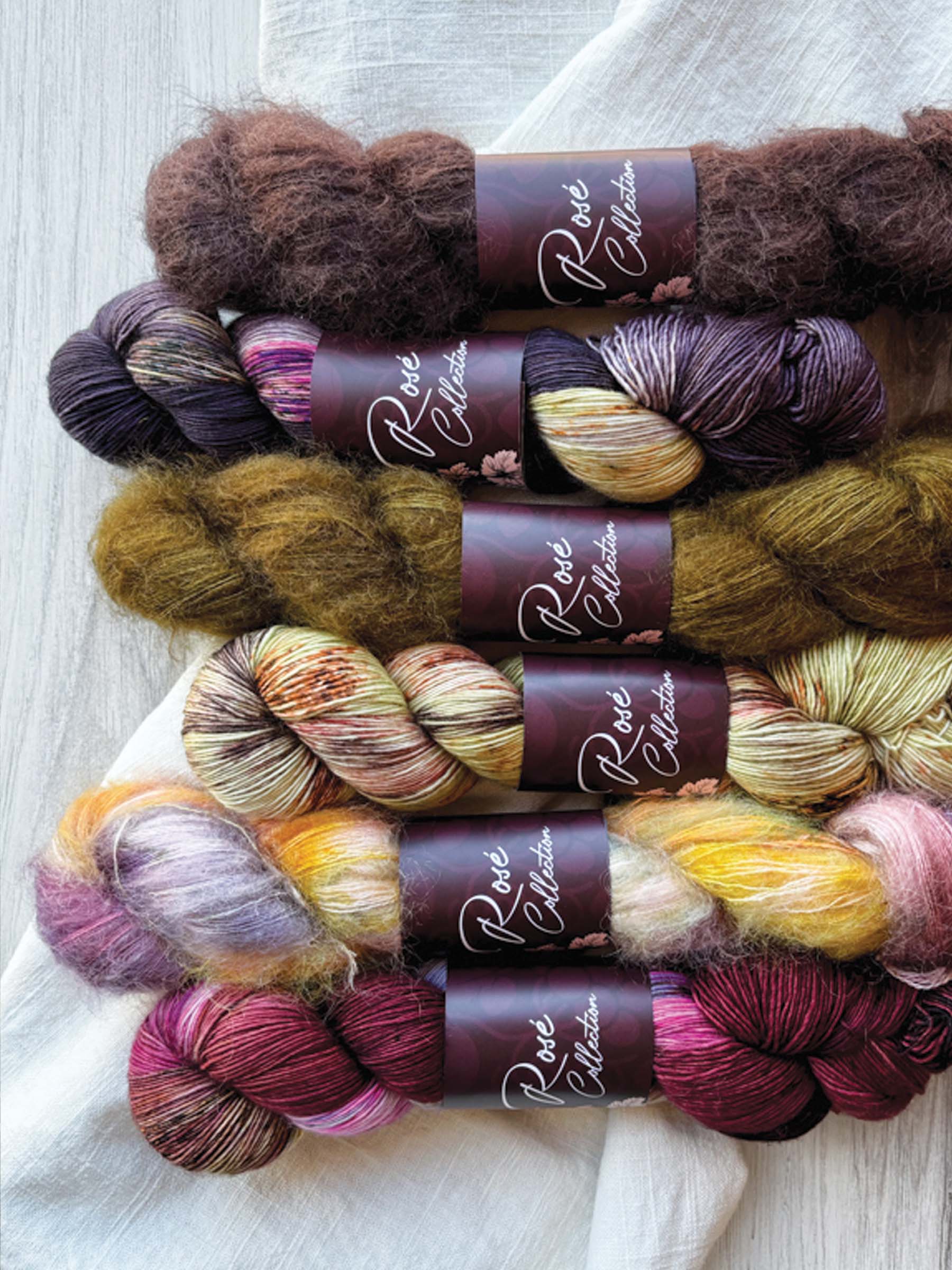 Make a delicious Nutmeg Scarf of your very own with 6 colorways from our Rosé Collection and the stunning Nutmeg Scarf pattern from Gotham Knits!