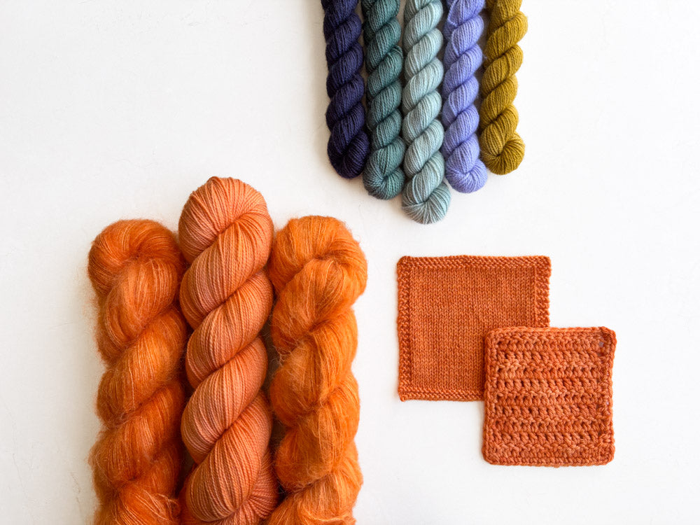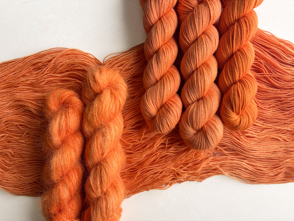 Colorway shown in the following order: Mohair, Suri, Phyllis Sock, Merino Sock, DK.