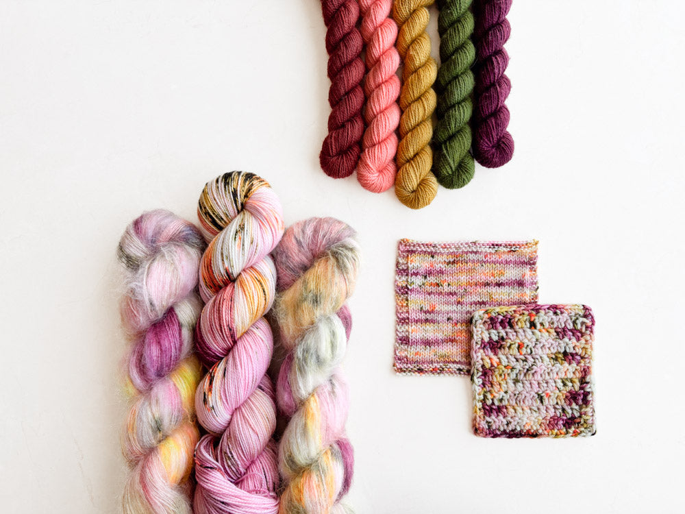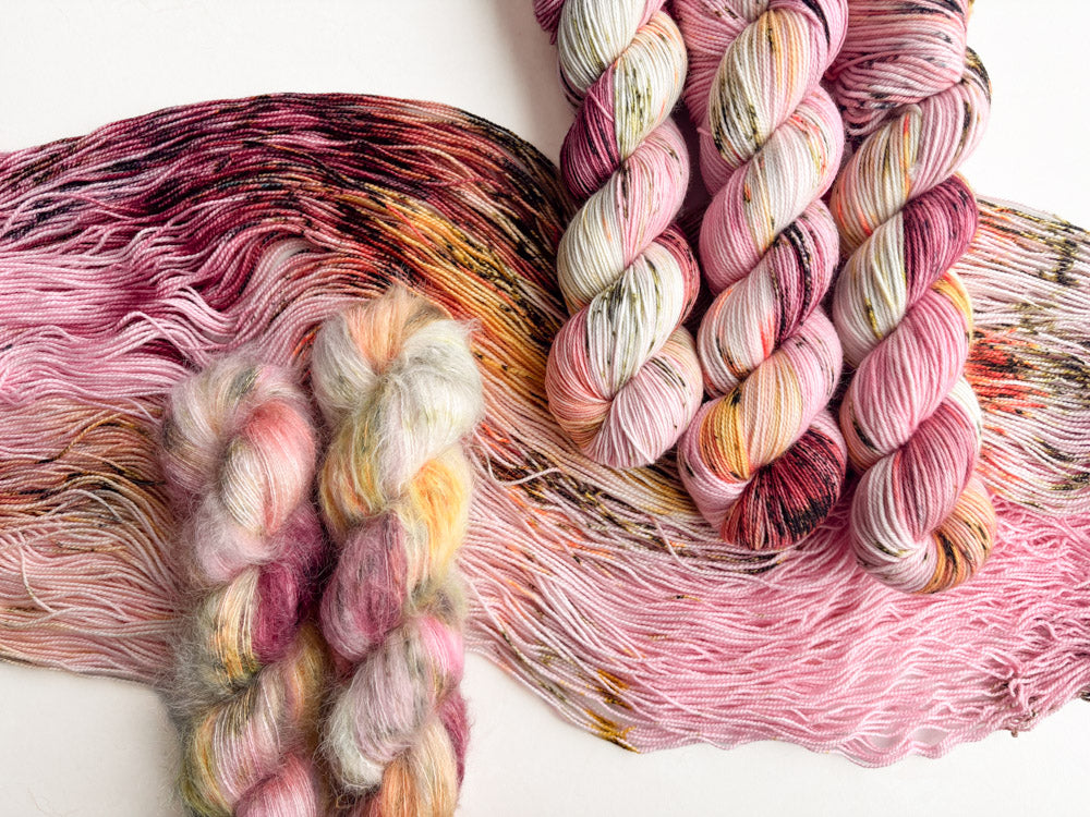 Colorway shown in the following order: Mohair, Suri, Phyllis Sock, Merino Sock, DK.