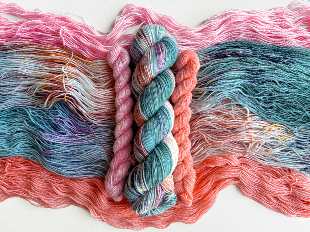 Each sock set comes with (1) 100g full skein + (1) 20g minis