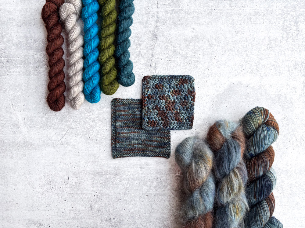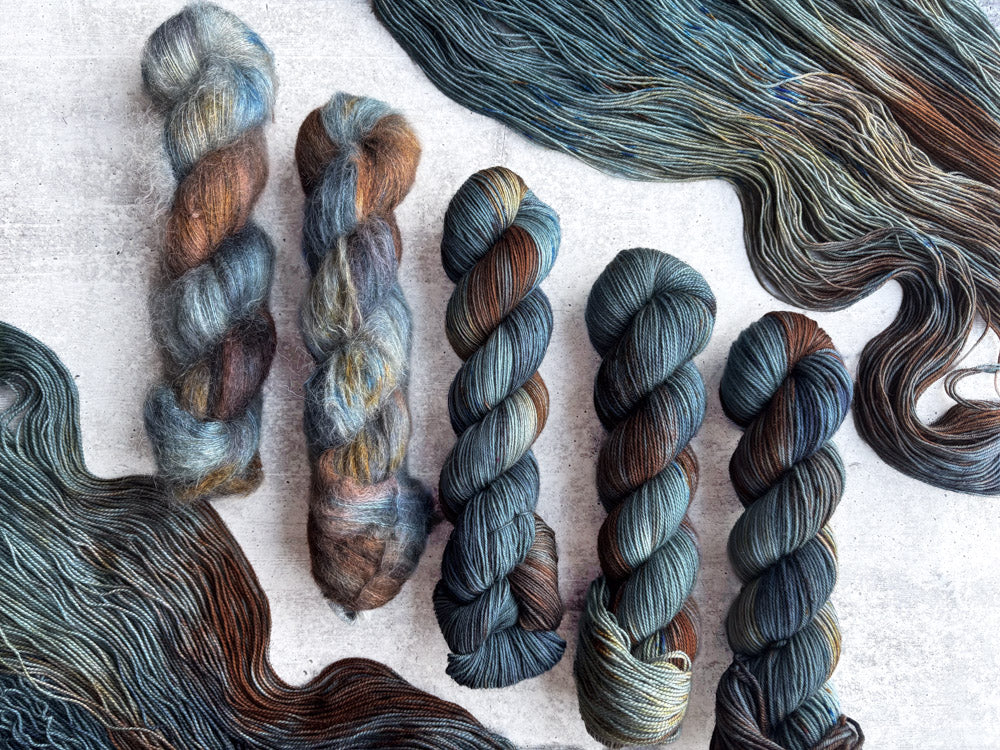 Colorway shown in the following order: Mohair, Suri, Phyllis Sock, Merino Sock, DK