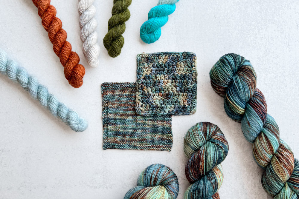 Knit swatch shown in Merino Sock, crochet swatch shown in Phyllis DK. Swatch will vary depending on base.