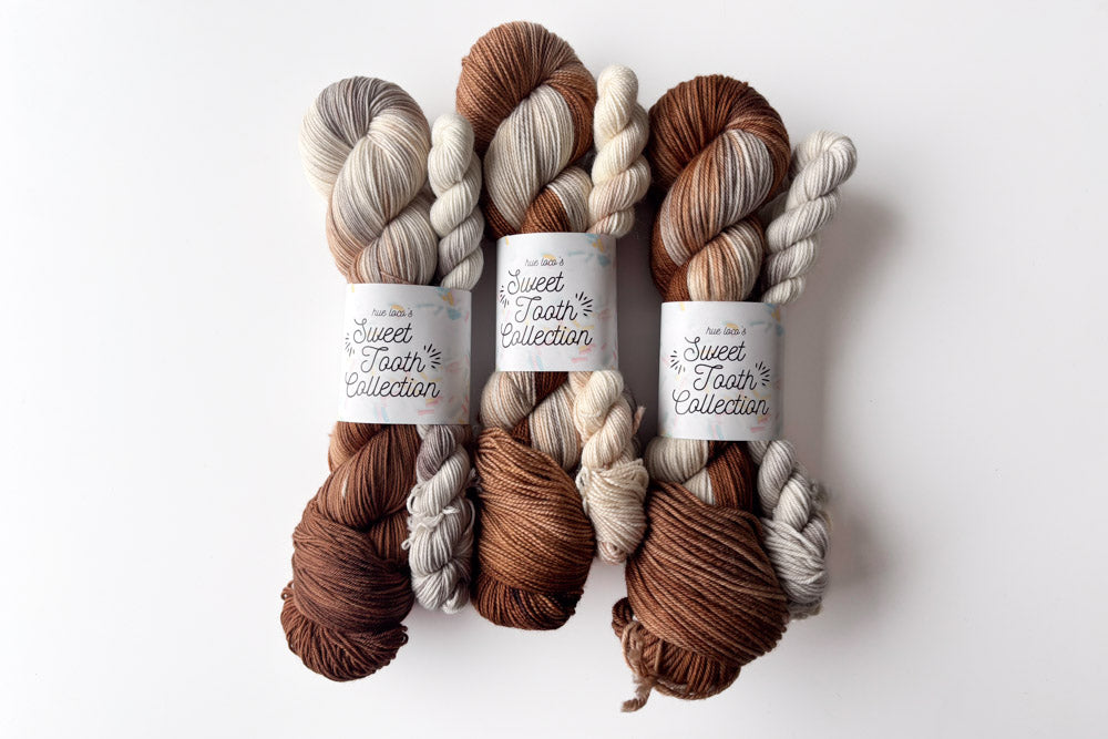 These sock sets are a unique spinoff of our monthly Sweet Tooth series showcasing a sweet treat for each month of the year! Featuring a tonal colorway specific to each dessert and two tonal minis, these sock sets are exclusive to Extravaganza 2025 so make sure to grab one while you can!