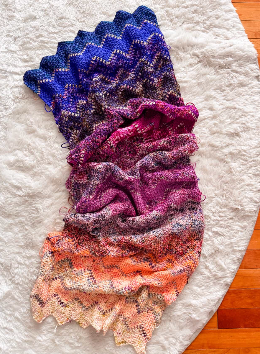 This year we're celebrating the mesmerizing colors of the night sky. Each color from our Starlight palette seamlessly fades into the next, creating a stunning visual experience. It's the perfect blend of warm and cool, evoking the magical transition of twilight into starlit skies. Expect speckled, tonal and semisolid skeins with shifting, both bright and moody values and layered jewel-toned hues! (photo courtesy of Toni Lipsey of TL Yarn Crafts)