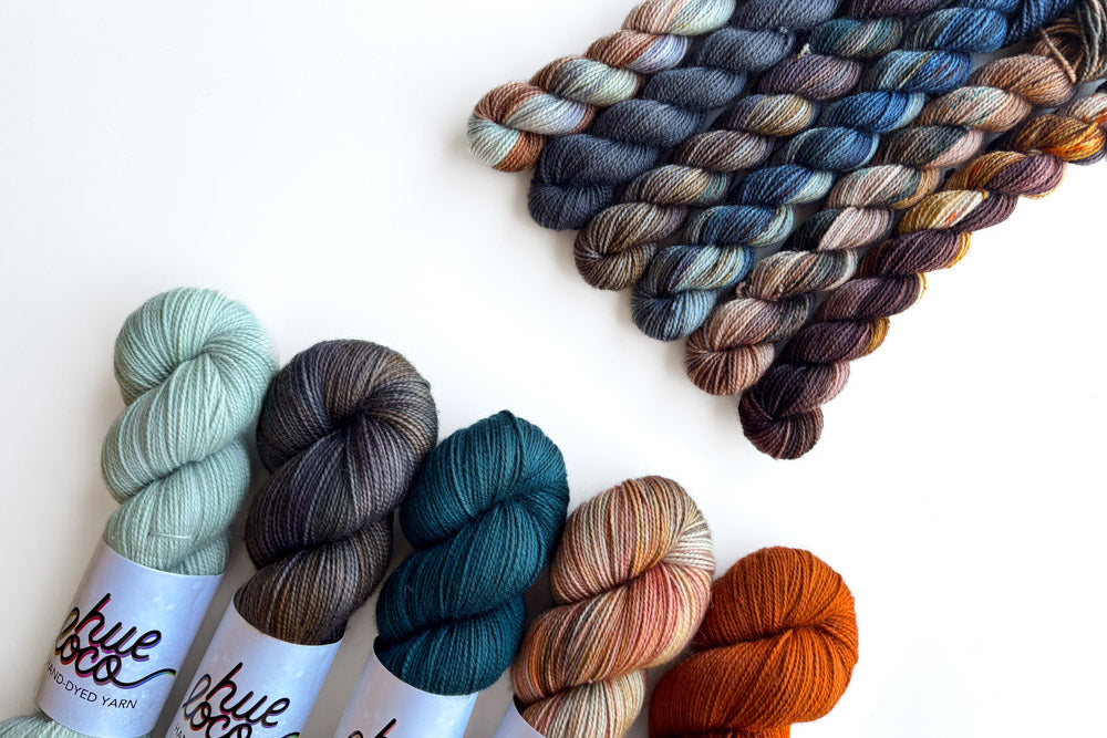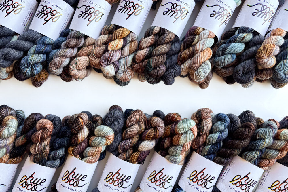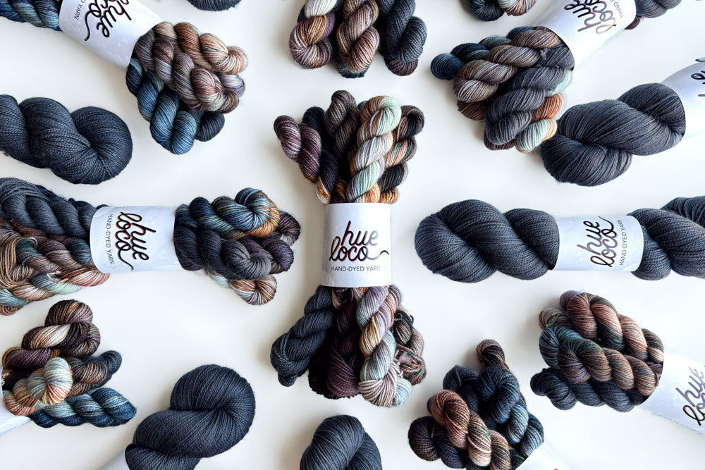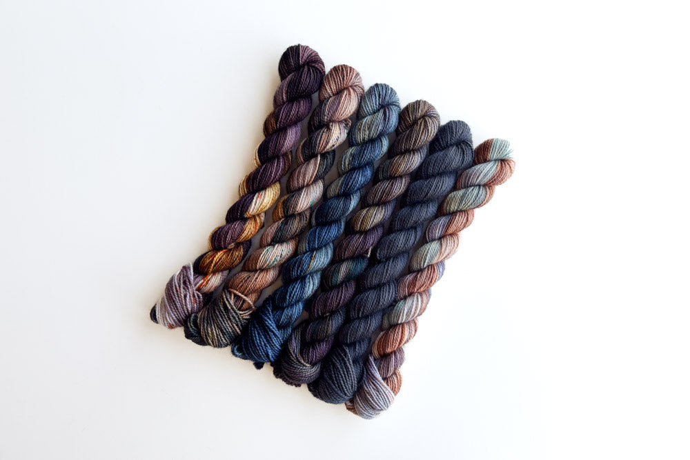 Snag a one-of-a-kind mini grab bundle featuring our semisolid, Cracked Pepper! Each grab bundle contains 6 (20g) mini skeins in Merino or Phyllis Sock. The mini breakdown for each bundle is as follows: 1 featured semisolid mini, 2 tonal minis and 3 speckled minis. All minis coordinate with our featured semisolid of the month.