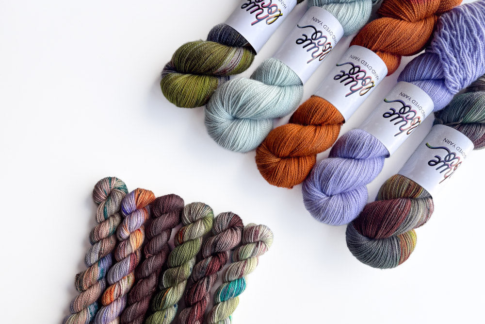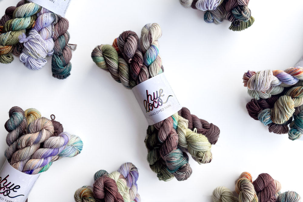Snag a one-of-a-kind mini grab bundle featuring our colorway, Pagosa! Each grab bundle contains 6 (20g) mini skeins in Merino or Phyllis Sock. The mini breakdown for each bundle is as follows: 1 semisolid mini, 2 tonal minis and 3 speckled minis. All minis coordinate with our featured colorway of the month.