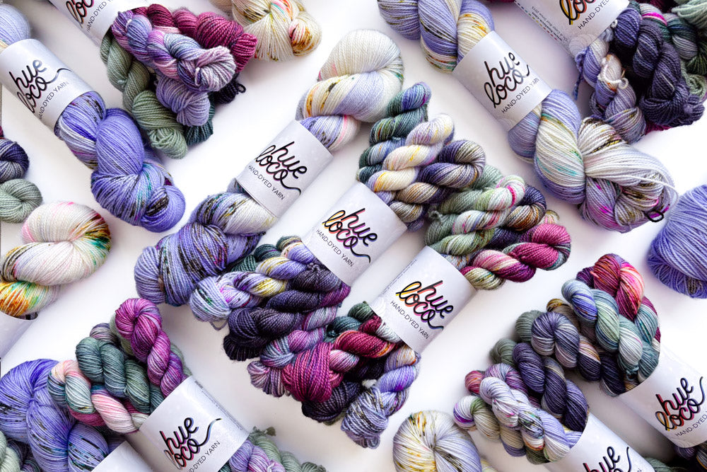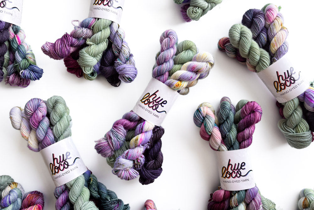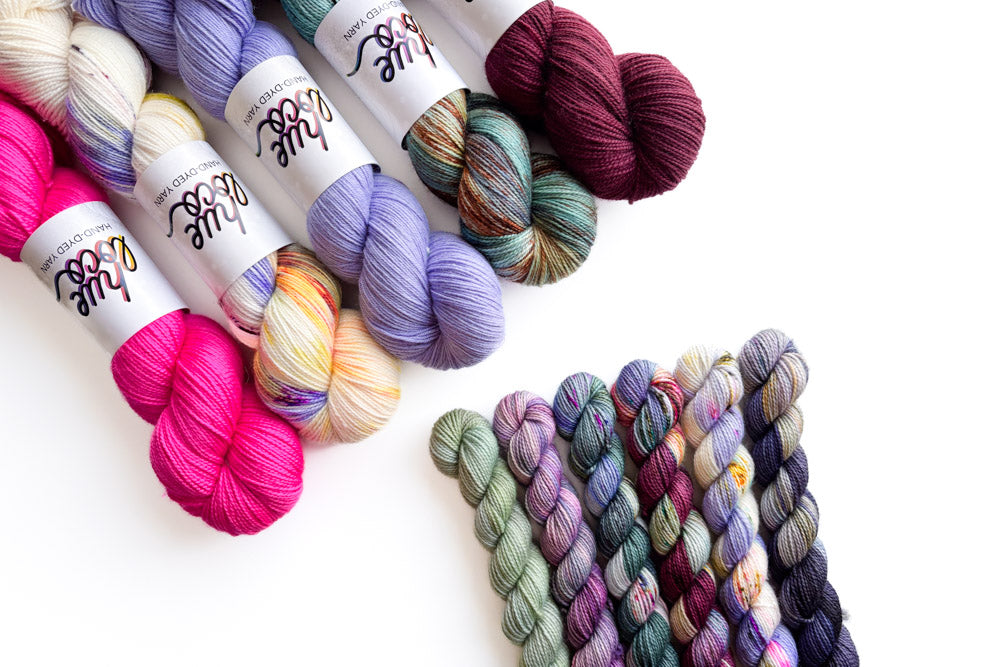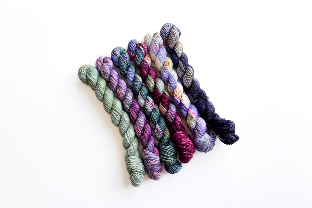 Snag a one-of-a-kind mini grab bundle featuring our colorway, Say Less! Each grab bundle contains 6 (20g) mini skeins in Merino or Phyllis Sock. The mini breakdown for each bundle is as follows: 1 semisolid mini, 2 tonal minis and 3 speckled minis. All minis coordinate with our featured colorway of the month.