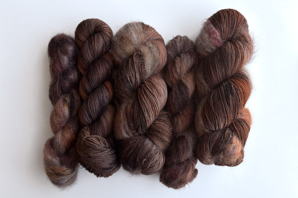 Assorted Truffles is a rich colorway with a warm taupe base, chocolatey brown and caramel pours, all sprinkled with charcoal and mahogany speckles!