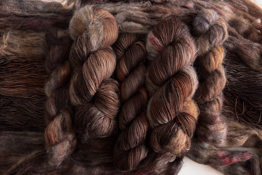 This decadent colorway comes with one skein of Spun Sock XL and one skein of Suri or Mohair all wound up into one big, bodacious skein!