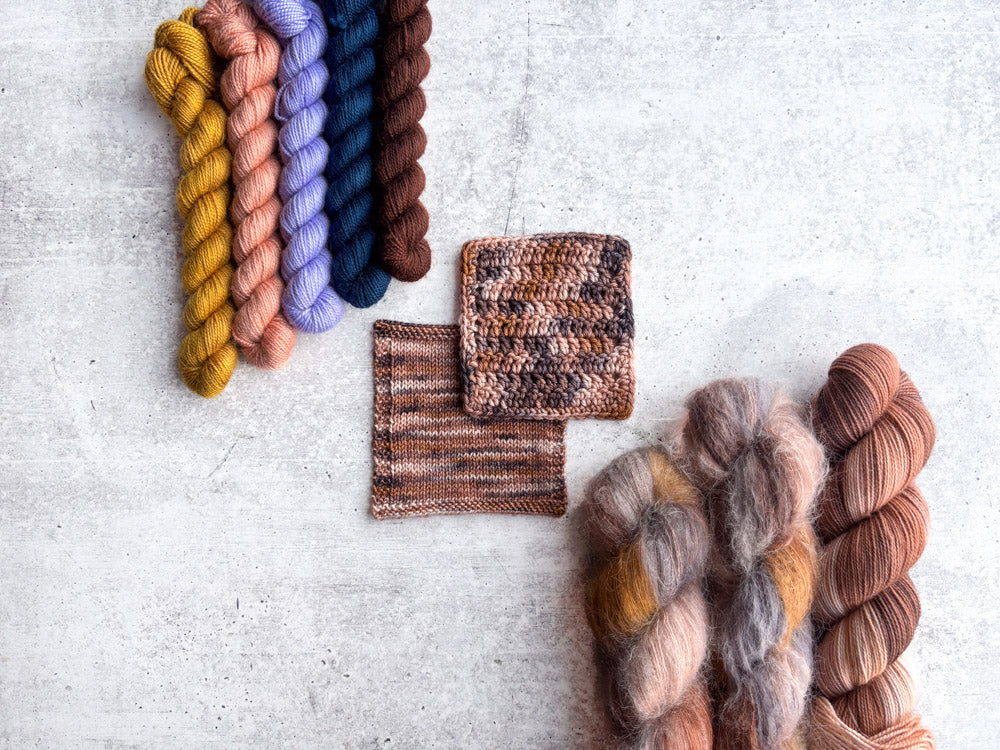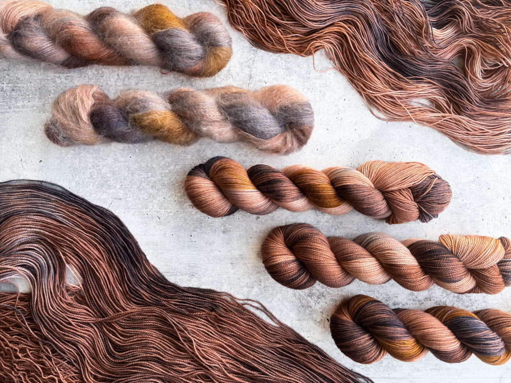 Colorway shown in the following order: Mohair, Suri, Phyllis Sock, Merino Sock, DK