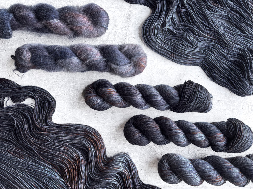 Terrain offers a moment of calm, like the stillness of peaks in the distance. A midnight blue-grey base is topped with complementing copper speckles, for a skein that feels refined and peaceful.