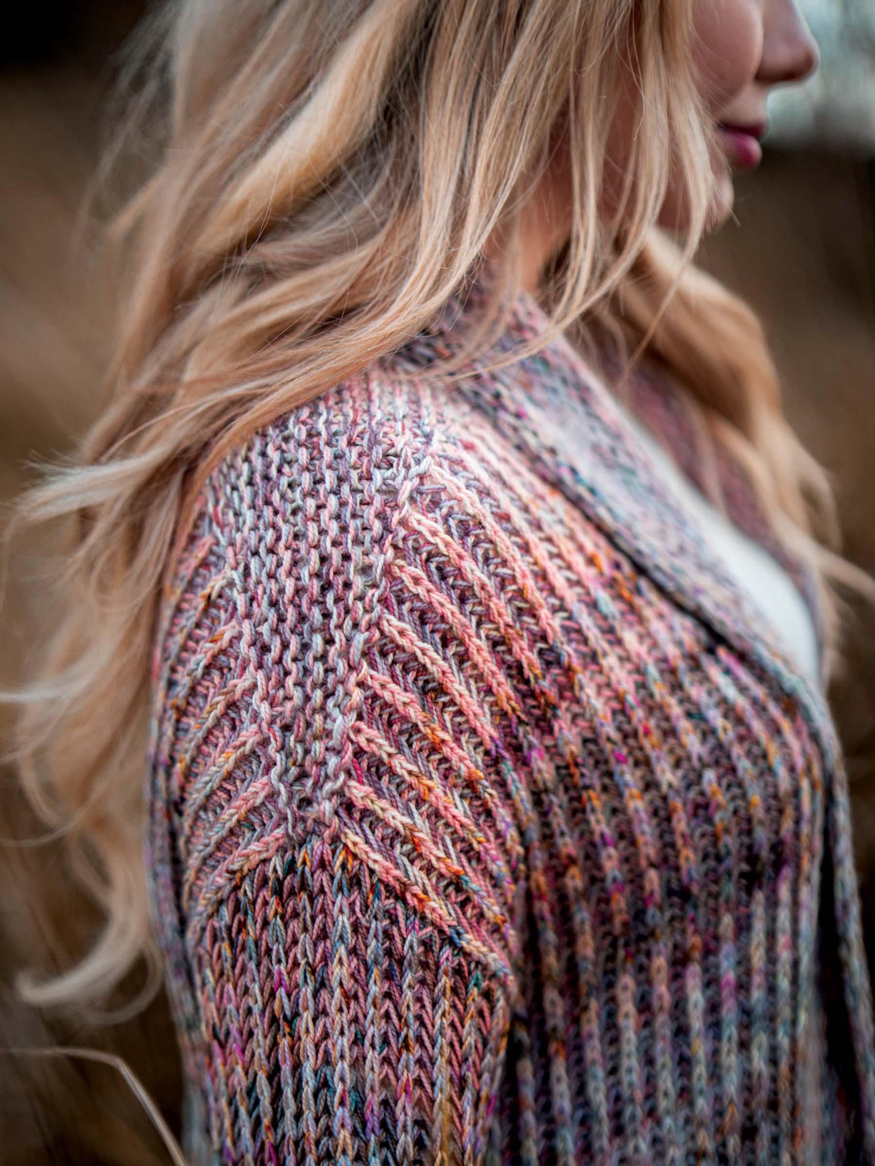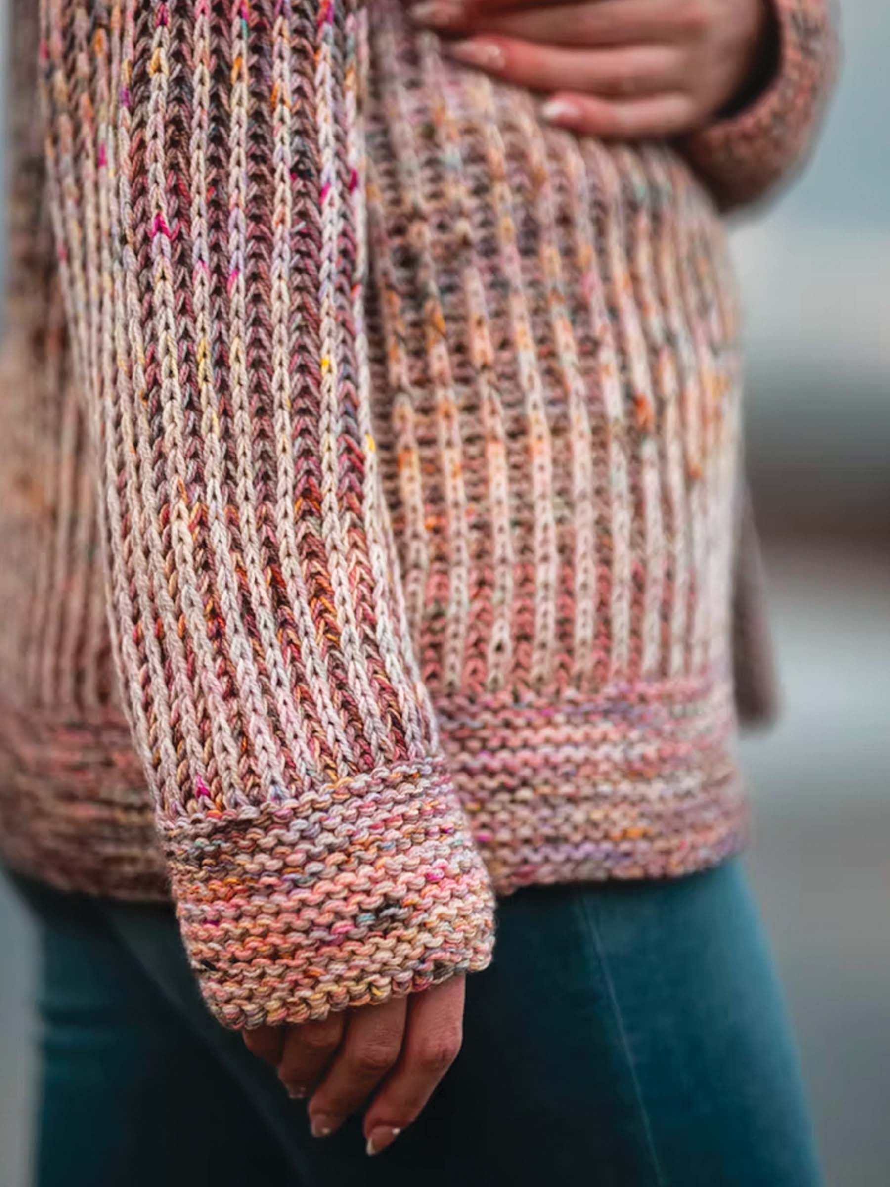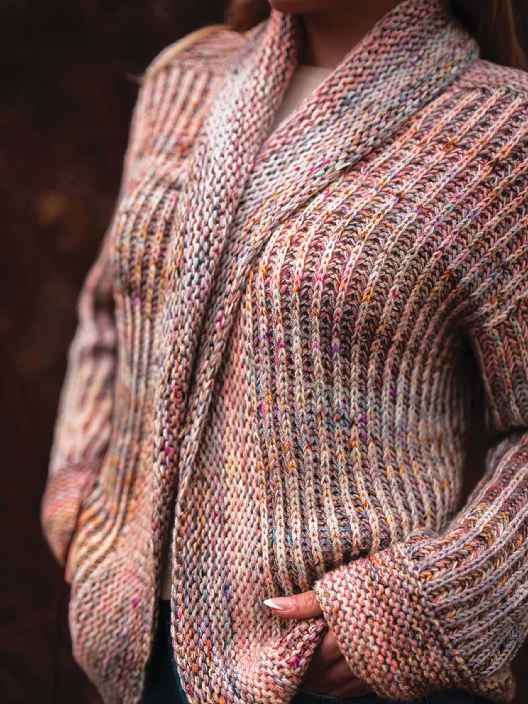 The Hearthside Cardigan is knit in two color brioche with two strands of fingering weight yarn held together for main color and two for the contrasting color (four strands total). Gentle strand changes create a soft marled effect and a plush, dimensional fabric with beautiful depth and color. Cozy, warm, and full of brioche squish!