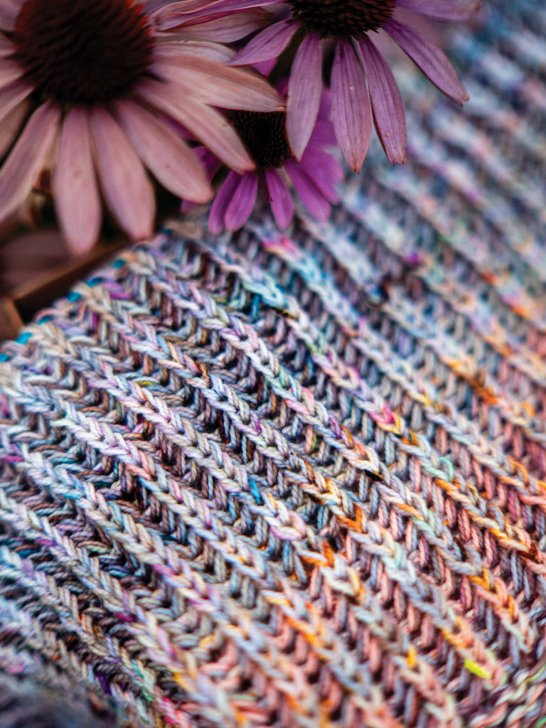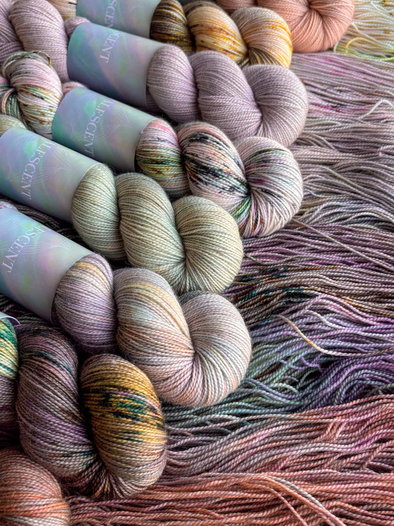The Opalescent Set is a harmony of color and light; yarn that dances between rose, lavender, and gold undertones interlaced with glimmers of copper, citron, and berry. Subtle pops of color catch the eye like shifting light creating movement and depth every stitch. This yarn embodies a serene yet spirited optical palette that feels both natural and luminous.