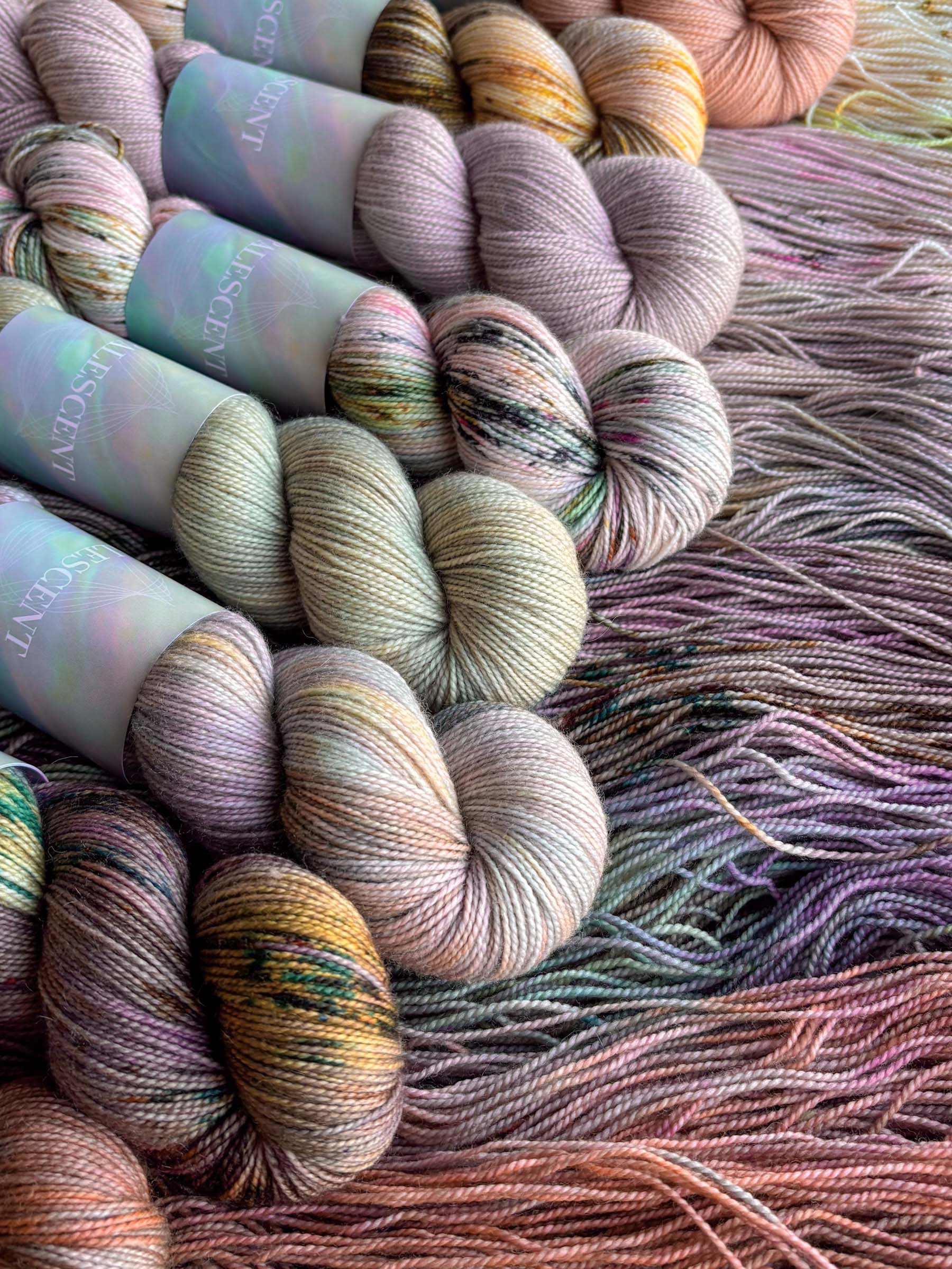 ✨ All 10 colorways from our Opalescent Collection on Merino Sock; Halo, Gossamer, Flare, Incandescent, Crystalline, Twinkle, Ethereal, Faceted, Kaleidoscopic, Tessellate