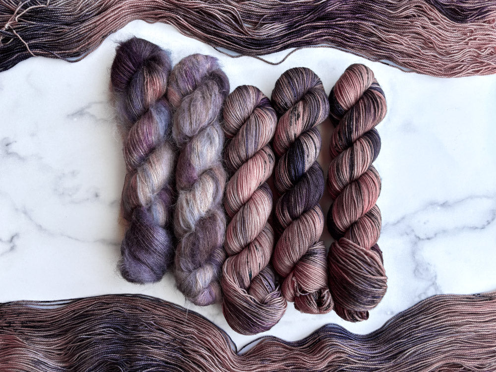 Inked is an active skein that pairs a toasty mauve base with lively dashes of deep charcoal, plum, and steel blue throughout.