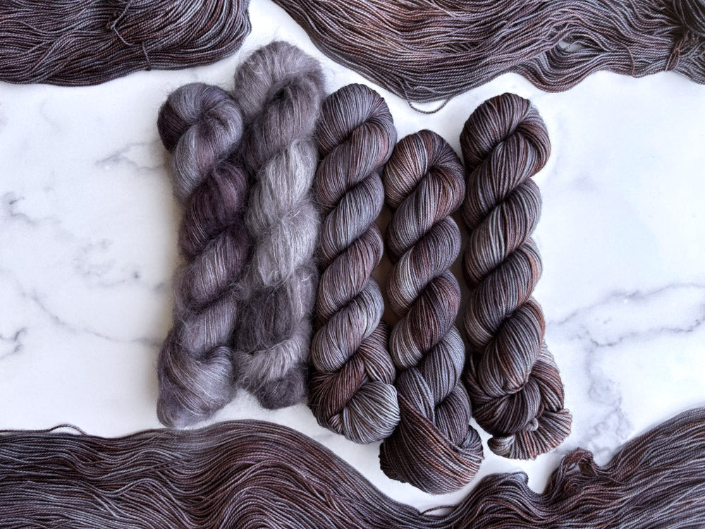 Smoke is a hazy cool-toned charcoal skein with overlays of rusty brown and no speckles, giving it an ethereal feel.