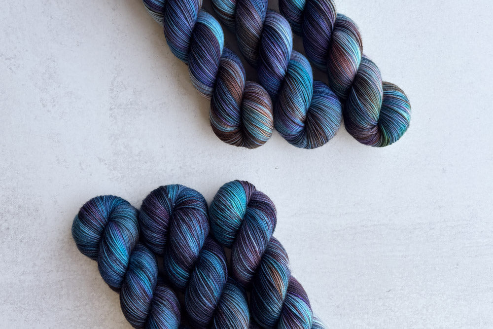 This colorway is photographed on Phyllis Sock and Merino Sock and may have slight variations when dyed on other bases.